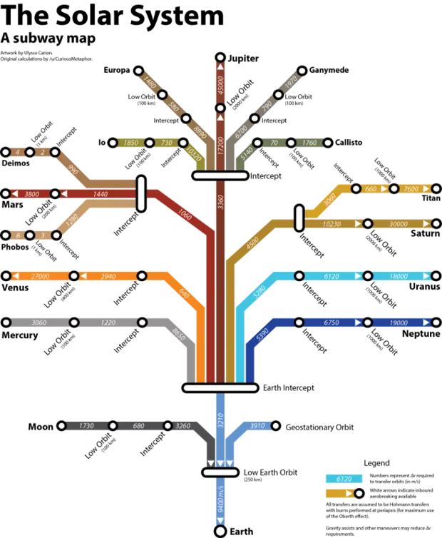 Этот график интересен тем, что это в каком-то смысле взгляд в более далекое будущее человечества. Если мы захотим комфортного и быстрого перелета по Солнечной системе, то придётся выйти ещё на порядок выше в освоении удельного импульса — понадобятся двигатели с УИ в несколько сотен тысяч метров в секунду.