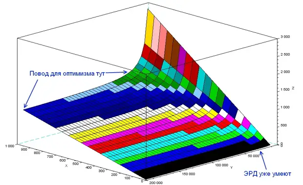 Почему я повторяю эти однообразные графики? Дело в том, что плоский участок, обозначенный как «повод для оптимизма» показывает, что, когда появятся двигатели с УИ больше 50000 м/с, в пределах Солнечной системы станет возможно более-менее сносно летать без кораблей стартовой массой в миллионы тонн. А ЭРД, которые есть уже сейчас, имеют УИ 25000-30000 м/с (например, СПД 2300).