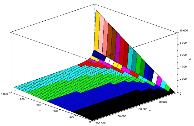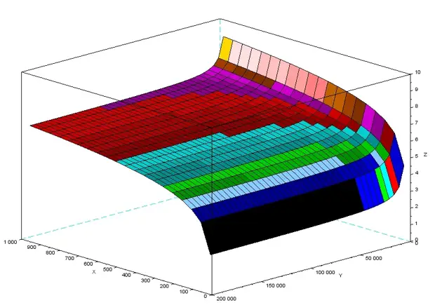 [m2 I]=meshgrid(10:50:1000,9000:5000:200000); m1=exp(10000*I.^-1).*m2; surf(m2,I,m1) Линейная шкала: