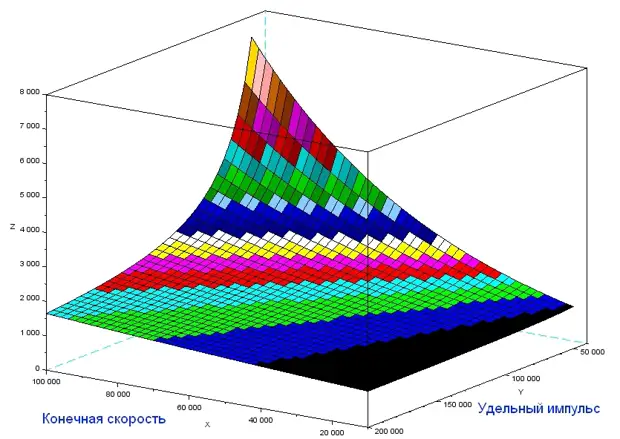 Построим ещё один интересный график. Пусть нам известна конечная масса — 1000 тонн. Построим зависимость начальной массы от удельного импульса и конечной скорости: